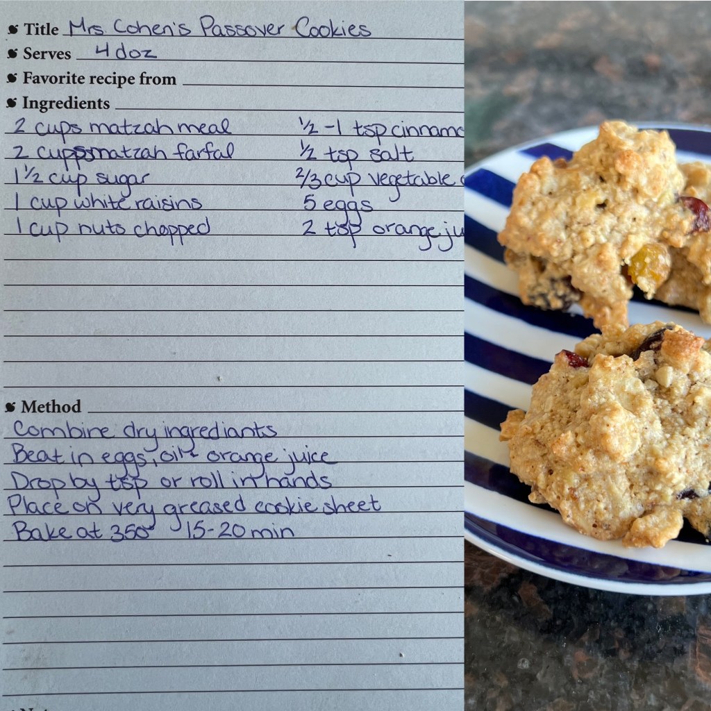 There’s not a ton to really love about kosher for Passover baking in general, but wow are these cookies delish. They’re kind of like a snickerdoodle crossed with an oatmeal raisin cookie, but with matzah instead of flour and oats. The recipe has been passed from Mrs. Cohen to Mrs. Cohen to Mrs. Rabiner-Cohen (me!) and I can’t wait to pass it down to my son one day.
