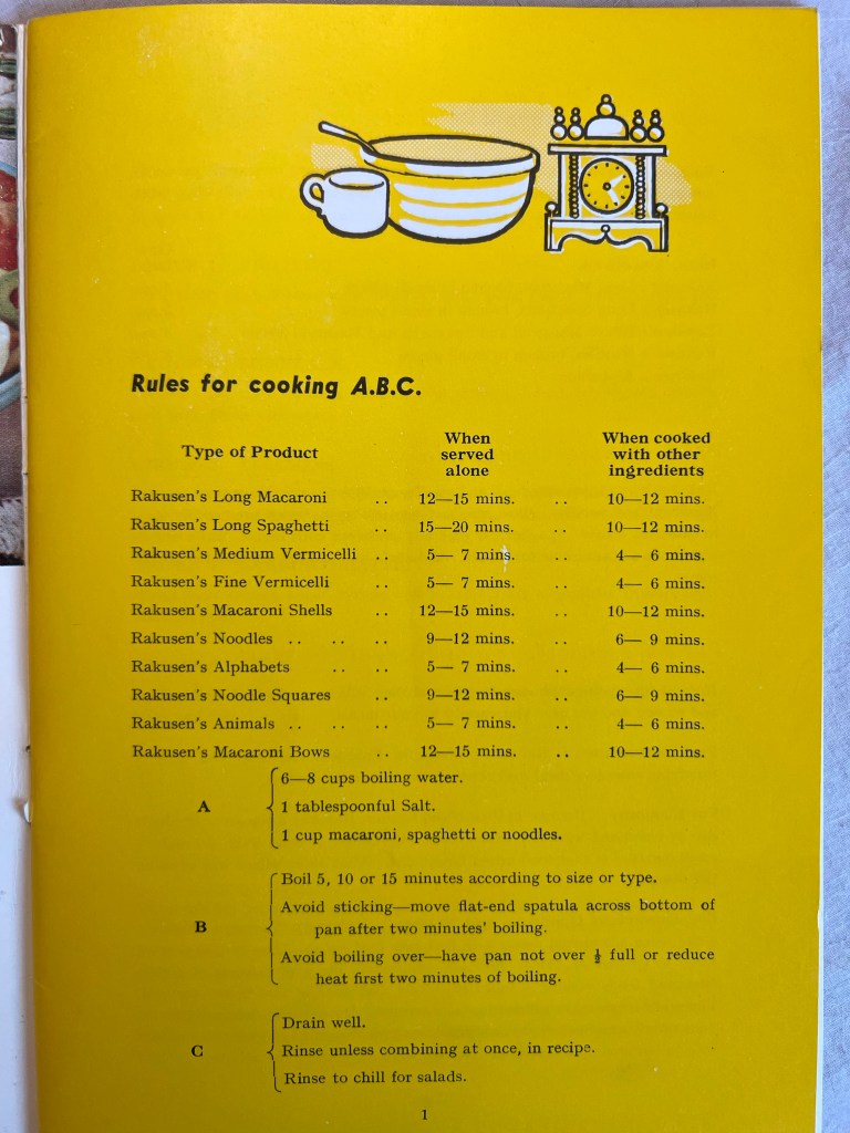 There’s no date on the booklet, but it looks to be about 1950’s/60’s, and online listings of them seem to be in line with that as well. The illustrations and funky fonts lean more toward late ’50’s/early ’60’s, but regardless are everything that just works for these old advertising booklets. As per usual though, I remain grateful that food photography has come a long way since that time period.
