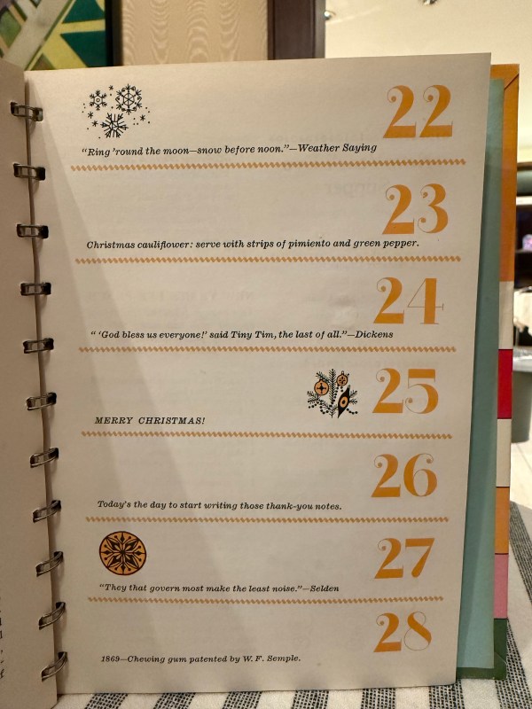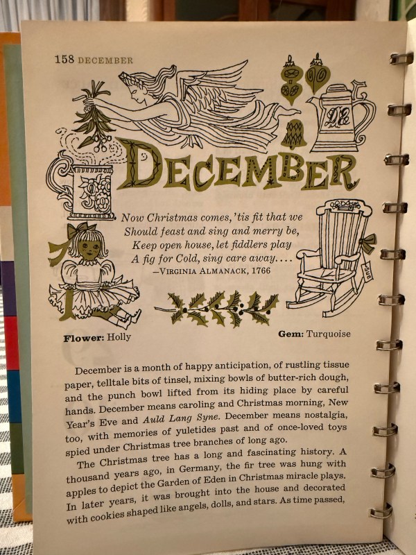 I was so excited to actually cook out of this book. Every month comes with its own introduction and a note on seasonal fruits and vegetables. And then the weeks are broken up. Each day has a quote or note, and each adjacent page has 2-3 holiday or seasonally appropriate recipes. It’s just delightful.