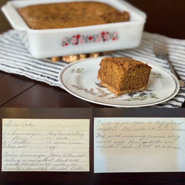 Reader, this cake is magnificent. It’s almost like an upside down coffee cake. The texture is light and fluffy from the chemical reaction of the sour cream (acid) and baking soda (base). The flavor, light on spices though it be for a spice cake, is divine. Dad suggested some icing on it. A cream cheese frosting would go well if you want to ice it, but it’s fine standing on its own.