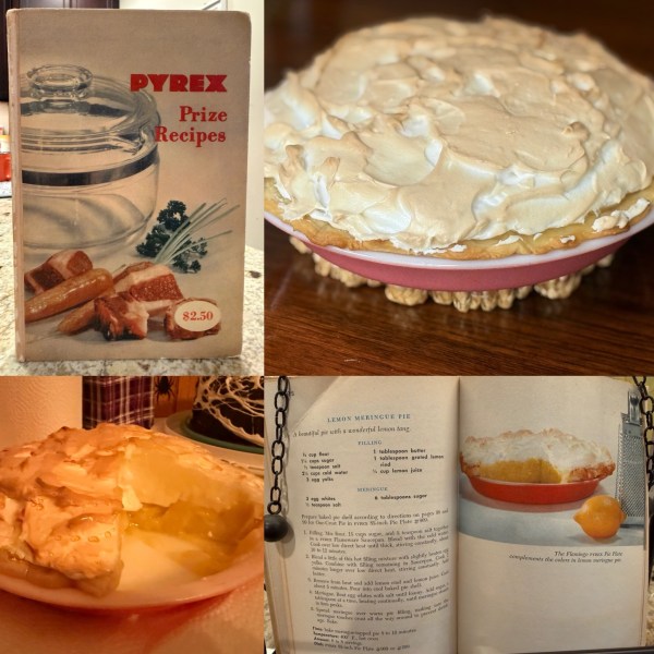 I love this little book. It’s a little love story for anyone who has these beautiful pieces of glassware in their home. Each recipe recommends a specific dish to use to make sure your recipe comes out perfectly. It makes good use of everything from the coffee pots to the Flameware to the little Flamingo Pie Plate I got to use for this pie. Enjoy a little bit more of the goodness from Pyrex Prize Recipes: